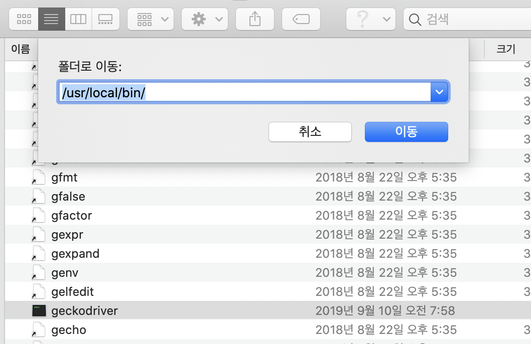 geckodriver를 /usr/local/bin에 넣어준다.(Shift + Command + G 를 눌러서 이동할 폴더 지정)