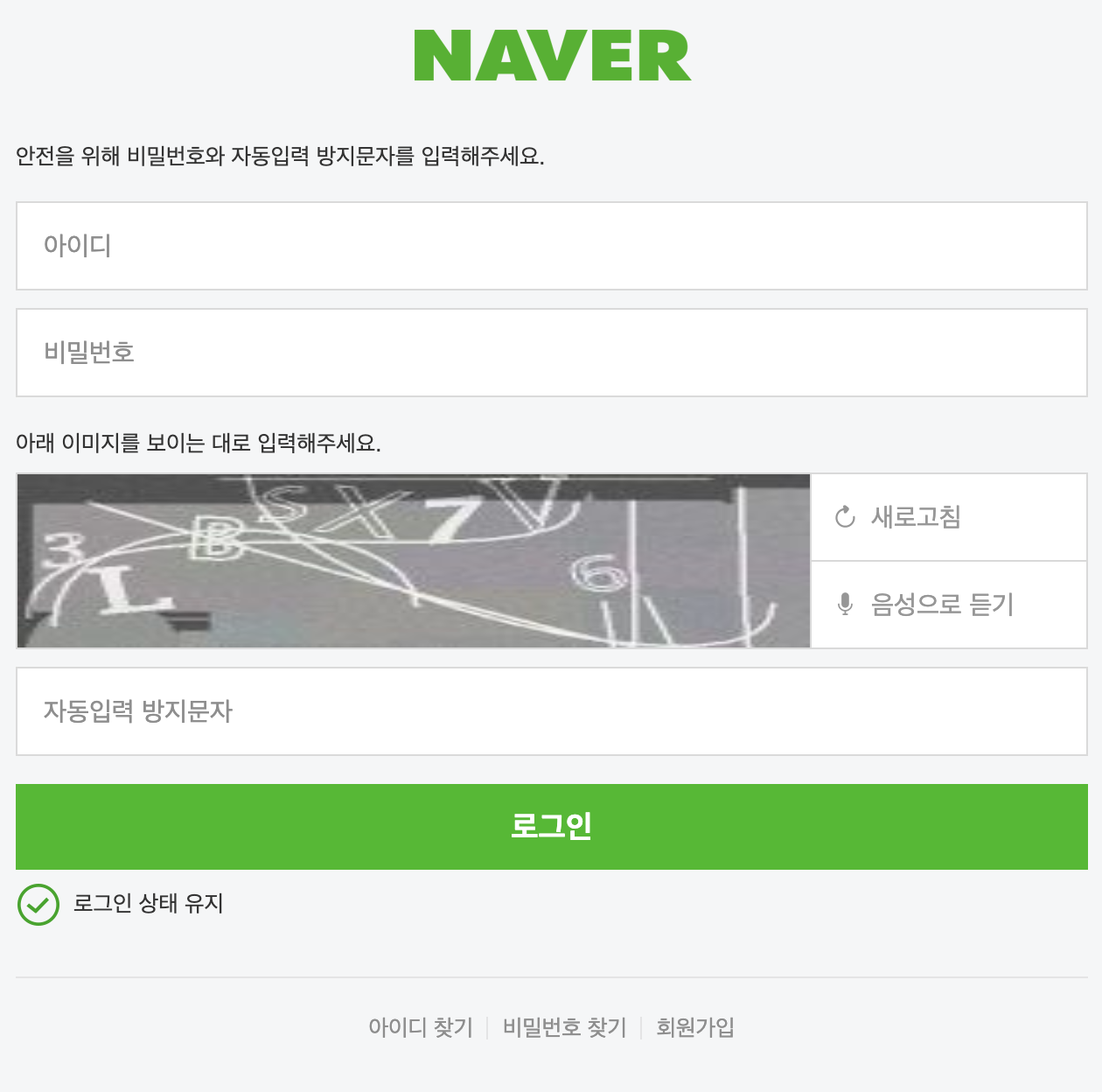 Selenium(셀레늄)으로 로그인 할 경우 캡챠(CAPTCHA)가 아래처럼 발생한다.