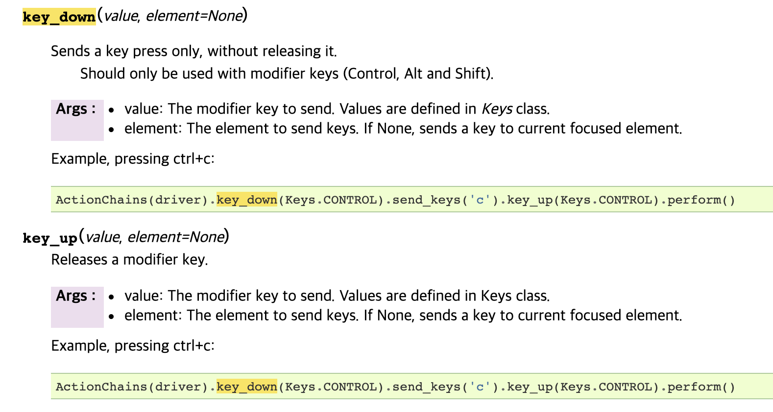 I am trying to do a simple Control + S in Chromedriver I tried webdriver.send_keys(Keys.CONTROL, "s") which didn't work I then tried ActionChains(driver).key_down(Keys.LEFT_CONTROL).key_down('s').