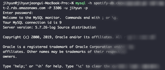 - mysql -h spotify-db.aasdfdfdfasdfsadfasdfasdfasdqatsot.ap-northeast-2.rds.amazonaws.com -P 3306 -u jihyun -p
