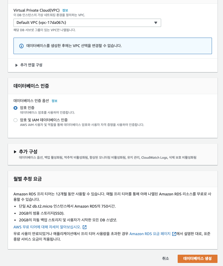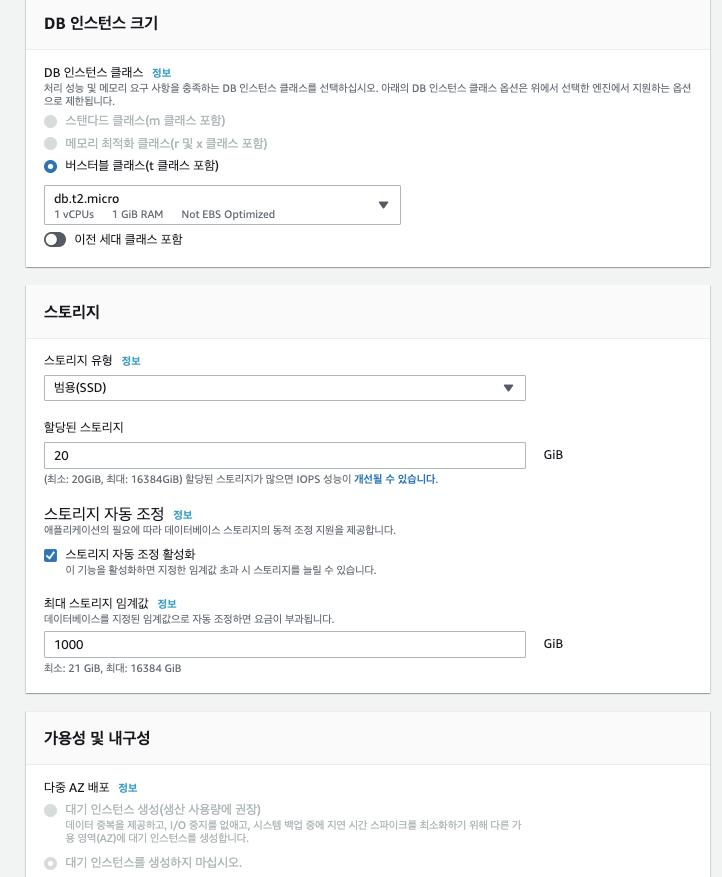 - 마스터 사용자 이름: 터미널을 이용해서 연결하기 때문에 잊어버리지 않도록 정합니다.