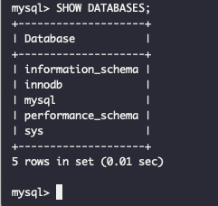 9. 접속이 잘 되면 SHOW DATABASES; 명령어를 사용해봅니다. 정상적으로 아래와 같이 뜬다면 MySQL을 생성이 잘 되고 접근까지 해보았습니다.