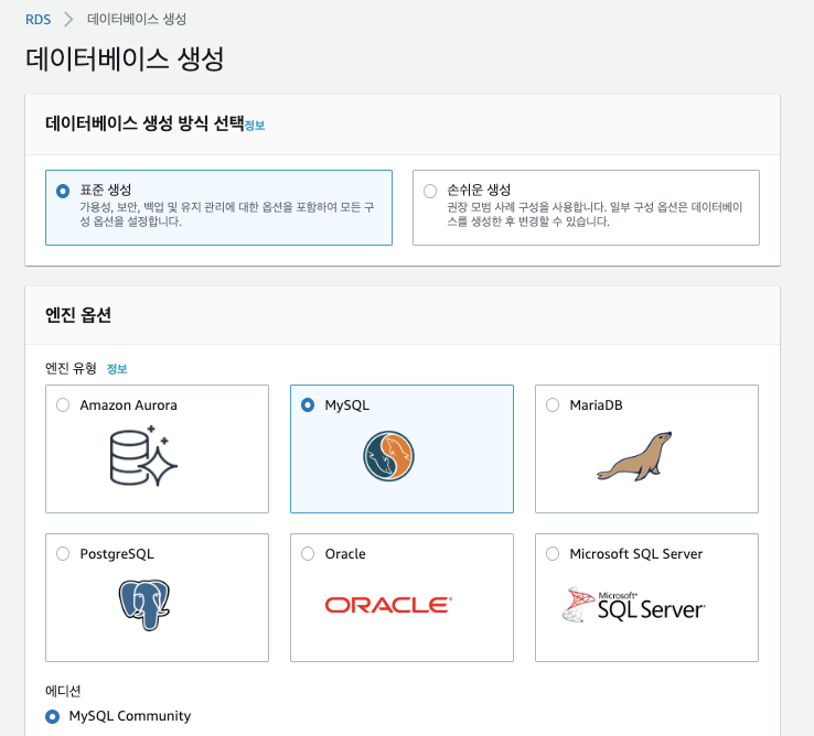 1. Amazon RDS(MySQL DB)를 생성합니다. 로그인 후 > RDS 클릭 > 데이터베이스 생성