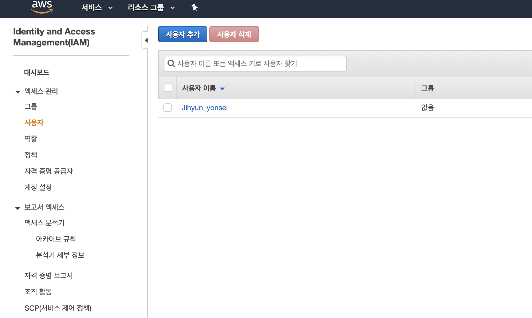 5. 모듈을 설치하고 AWS DynamoDB에 access 해보겠습니다. AWS Access Key ID를 발급 받기 위해서는 먼저 IAM > 사용자 추가를 해야 합니다. 추가를 하게 되면 AWS Access Key, AWS Secret Access Key를 얻을수 있습니다.