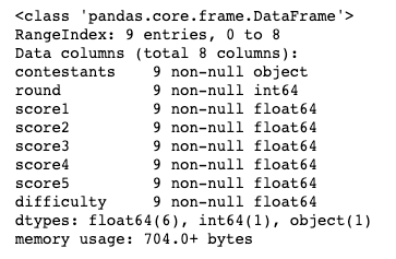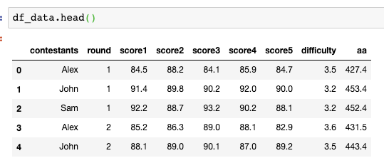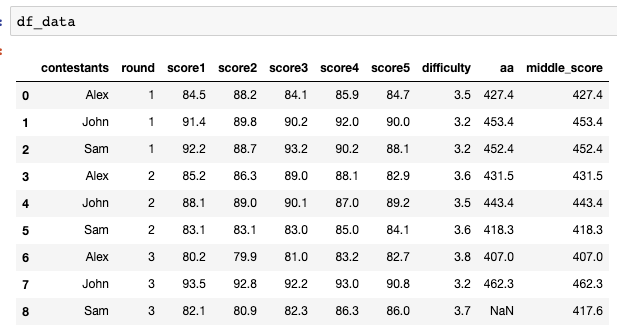 data = {'contestants': ('Alex', 'John', 'Sam', 'Alex', 'John', 'Sam', 'Alex', 'John', 'Sam'),