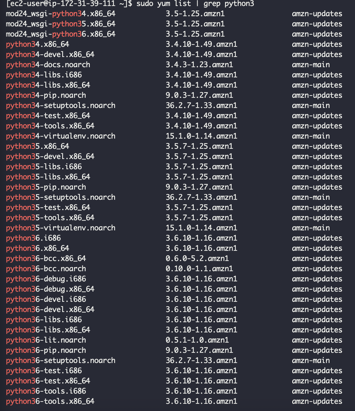 sudo yum list | grep python3 명령어를 통해서 python3 어떤 버전이 설치 가능한지 확인합니다. 3.6 버전이 가능하군요.