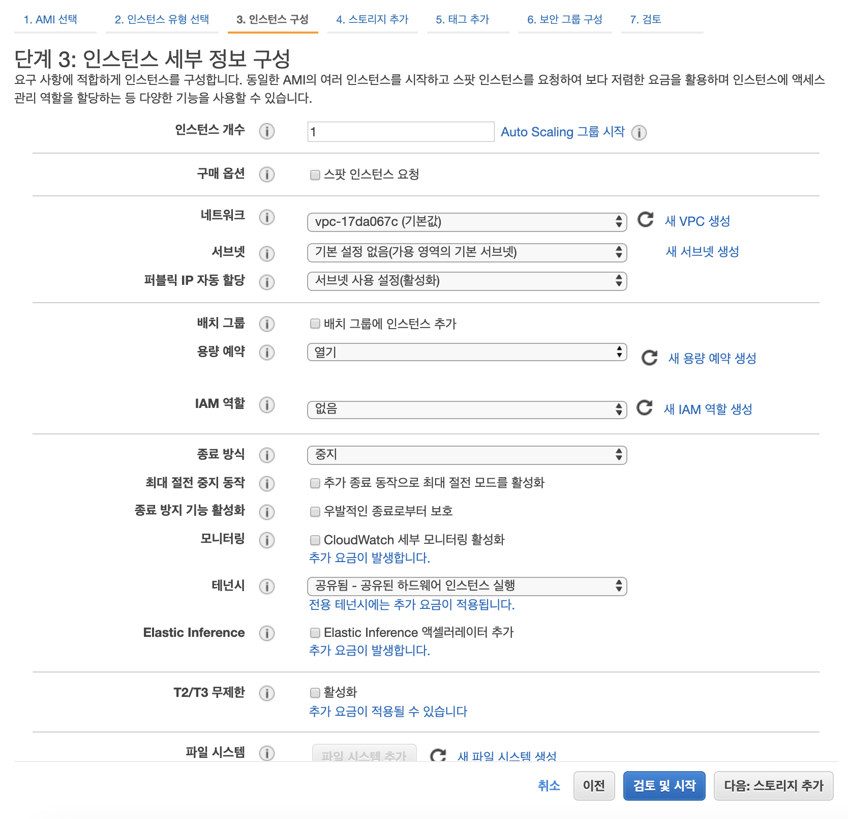 인스턴스 개수 1개, 나머지는 특별히 설정해줄게 없으므로 다음으로 넘어갑니다.