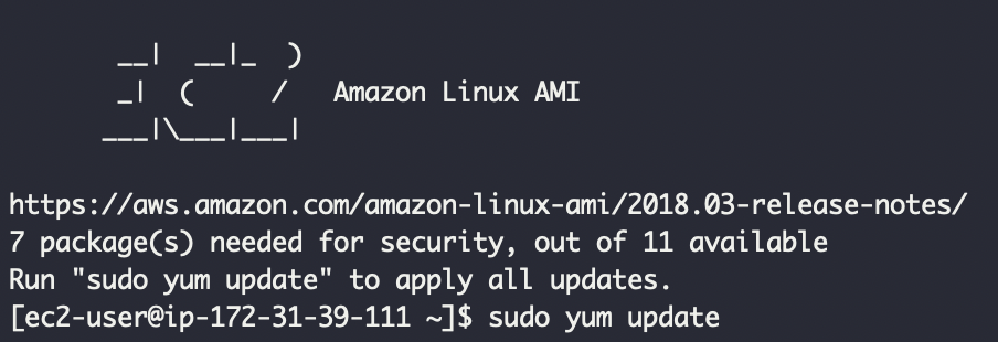 정상적으로 접속하면 아래와 같이 EC2 라고 뜹니다. sudo yum date를 run 해달라고 하니 그대로 해줍니다.
