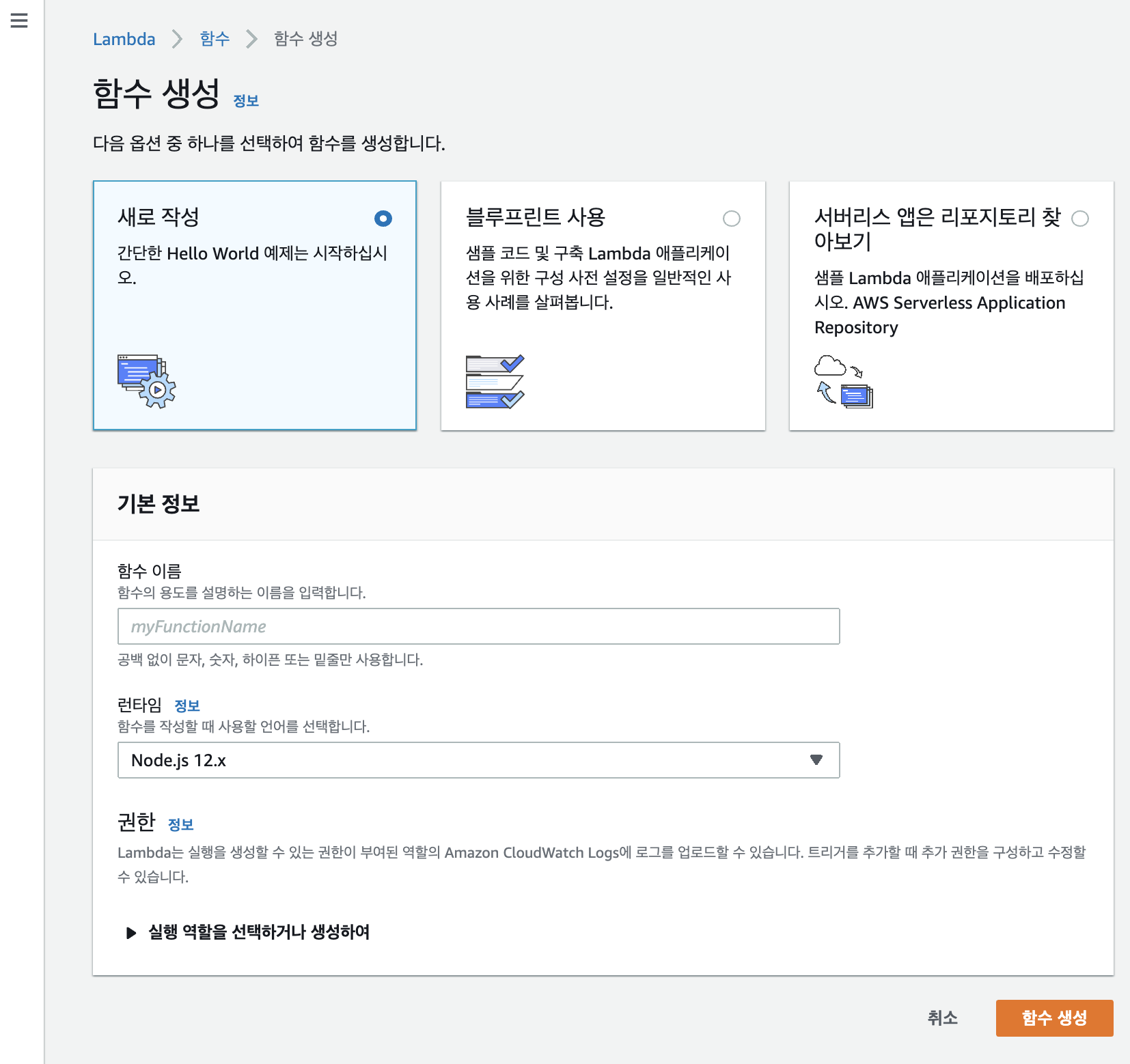 '함수 이름' 은 원하는 이름 입력하고 런타임은 파이썬 3.7로 하고 '실행 역할'은 기본 Lambda 권한을 가진 새 역할 생성으로 합니다.