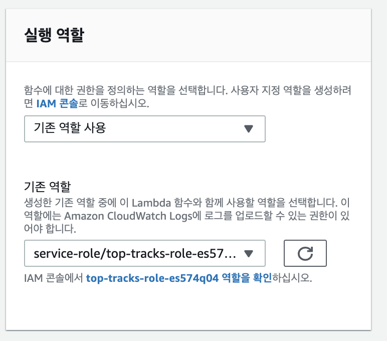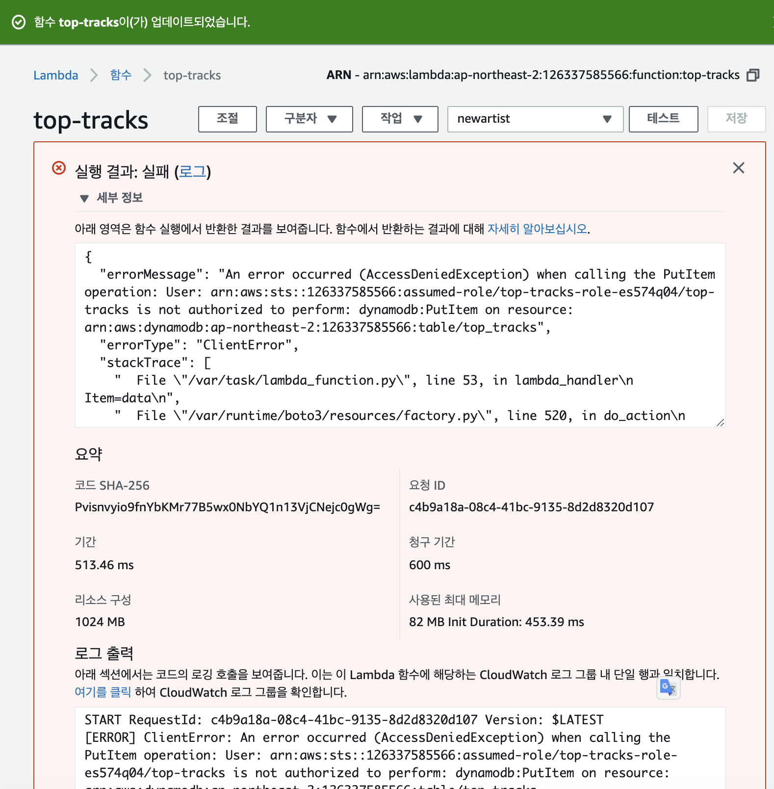 에러의 원인은 실행 역할에 권한 문제입니다. 아래 'top-tracks..... 역할을 확인' 클릭 >