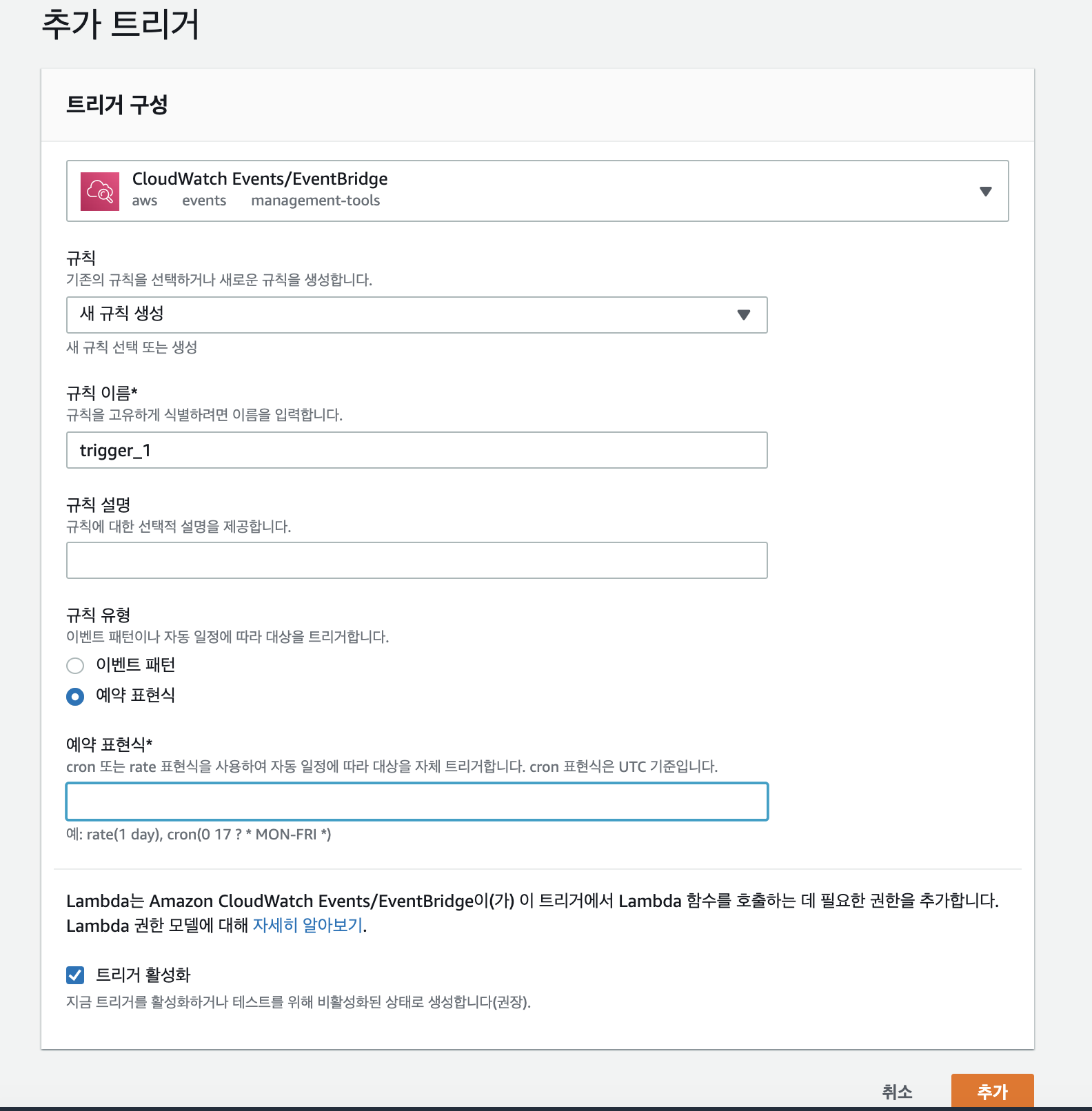 예를 들어 CloudWatch Events/EventBridege를 선택한 후 > 새 규칙 생성 > '예약 표현식' 을 보면 rate(1 day), cronjob 형태로 트리거를 구성 할 수 있다.