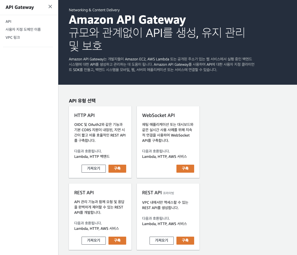 이제 Amazon API Gateway를 하나 생성 합니다. REST API 구축 선택. (프라이빗이 아닌 걸 선택 합니다.)