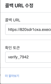 페이스북으로 가서 > Webhooks > 콜백 URL 추가 클릭 > 위에서 복사한 API 게이트웨이 엔드포인트를 콜백 URL 입력 > 확인 토큰에 람다 함수에서 작성한 veryfy_token 값 입력