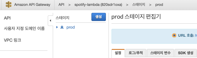 배포가 정상적으로 되면 Amazon API Gateway 가 아래와 스테이지가 생성 되고 URL 호출 페이지가 생깁니다.