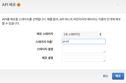 스테이지 이름을 임의로 작성 후 > 배포