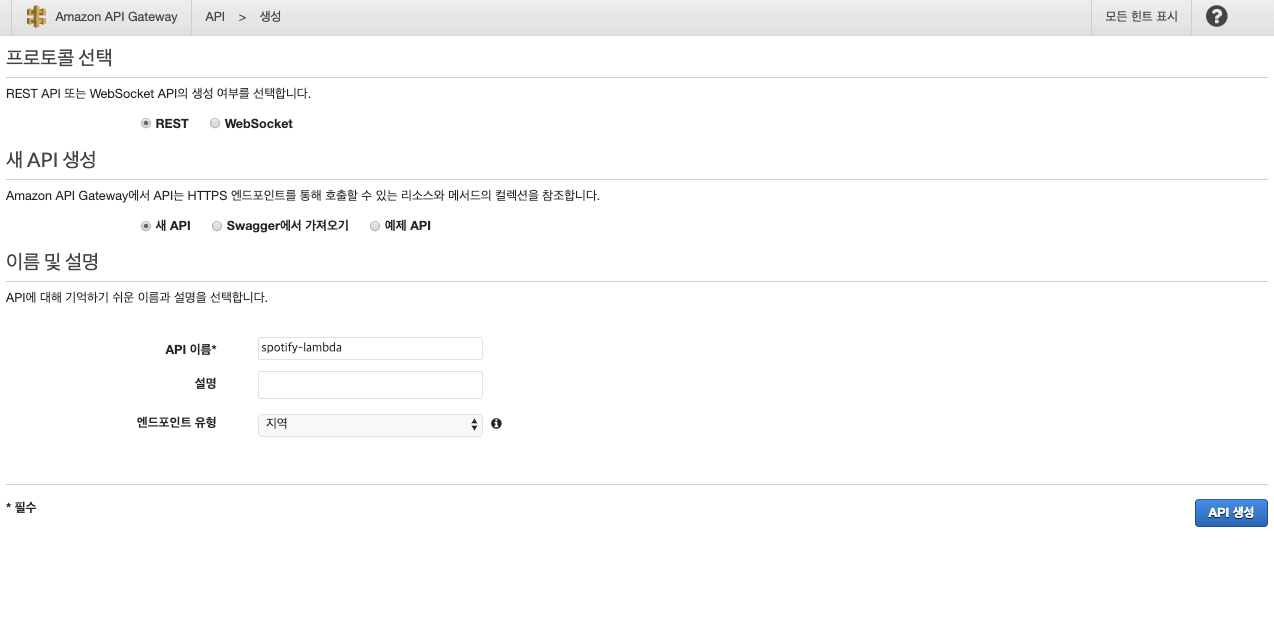 아래의 설정 값으로 하고 API 생성