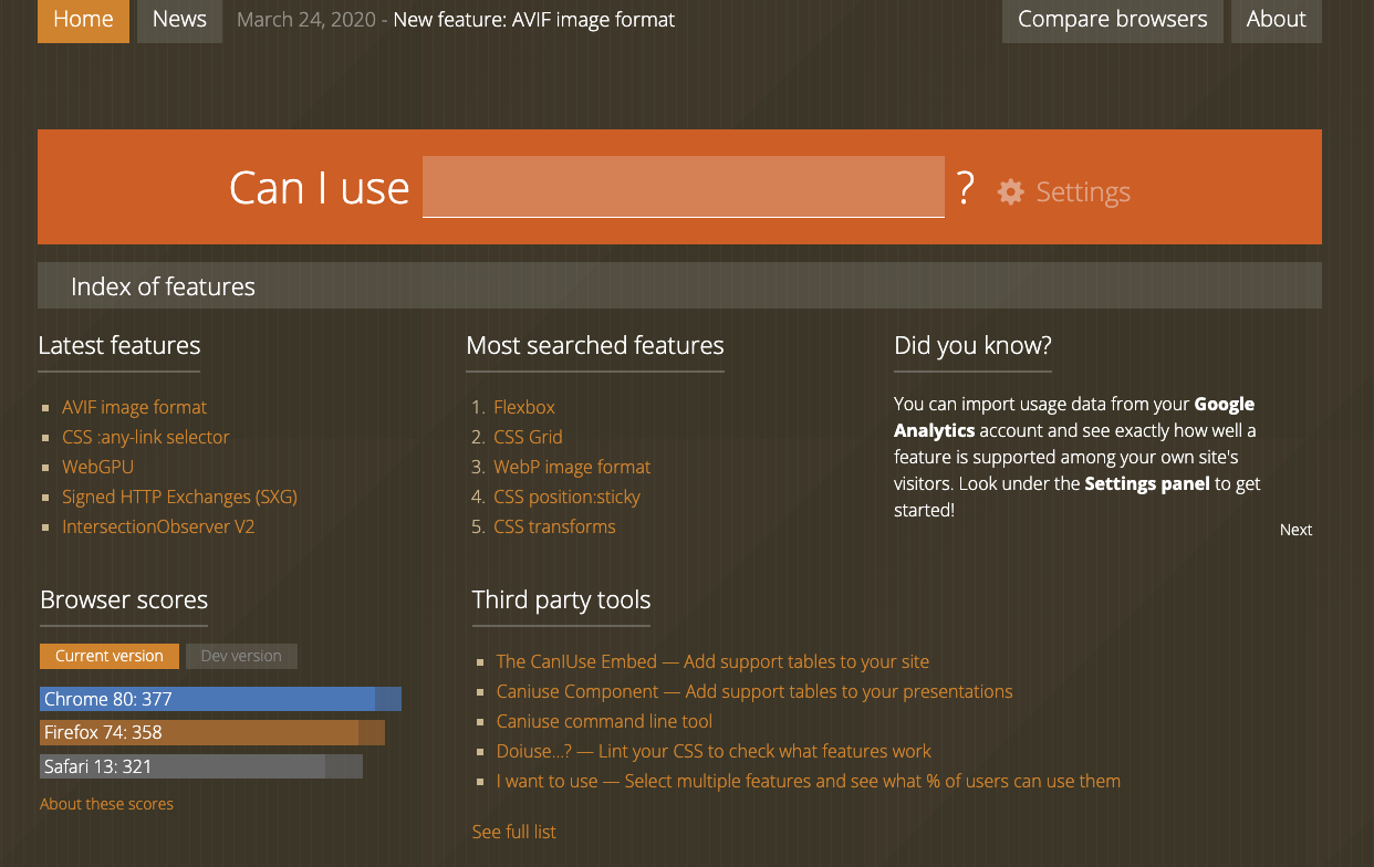 About "Can I use" provides up-to-date browser support tables for support of front-end web technologies on desktop and mobile web browsers. The site was built and is maintained by Alexis Deveria, with occasional updates provided by the web development commu