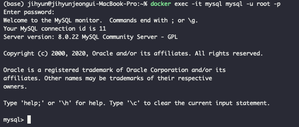2. docker exec -it mysql mysql -u root -p 명령어를 실행하면 다음과 같이 MySQL를 정상적으로 사용할 수 있다.