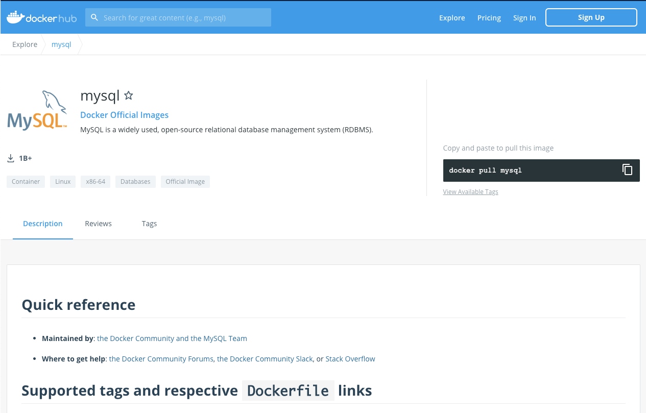 2. MySQL 공식 도커 이미지임을 확인한다. 그리고 docker pull mysql 명령어를 복사한다.