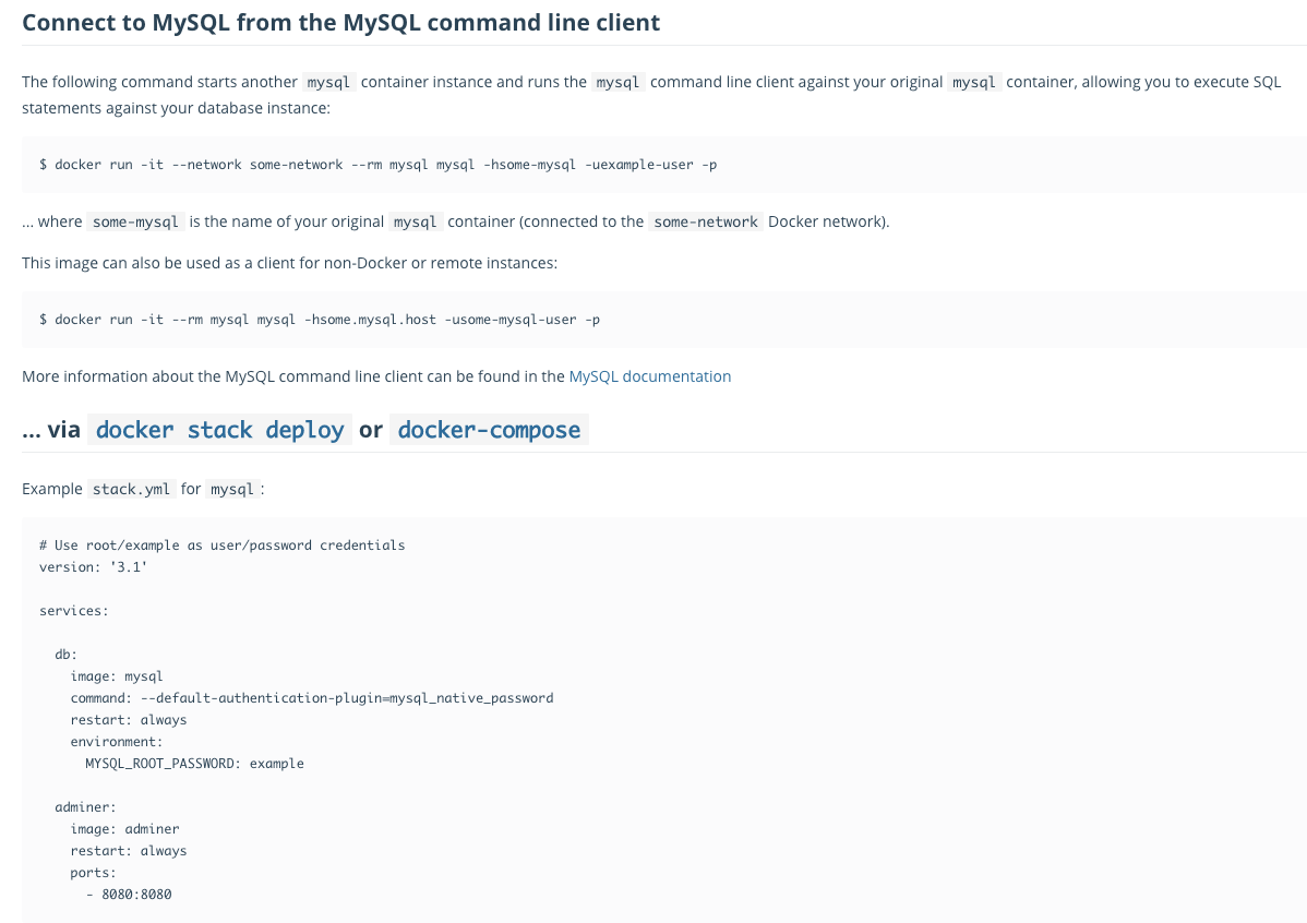 1. 해당 페이지에서 MySQL 도커 이미지 구동 방법에 대해서 설명하고 있다. 터미널 또는 CMD창(윈도 사용자)을 활용하여 아래 명령어를 참고하여 도커 이미지를 구동한다.